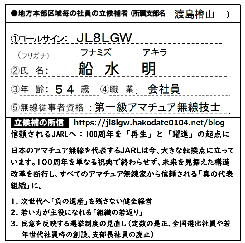 私、JL8LGW は、2026(令和8)年のJARL通常選挙において、